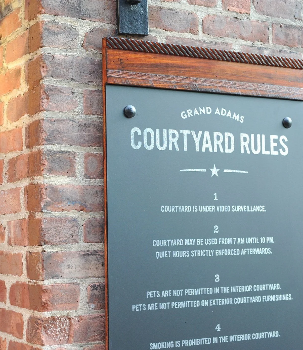 When Greystar Real Estate Partners approached us to rebrand their historic Hoboken property built in 1906, the possibilities of branding opportunities were endless. Originally the historic Keuffell and Esser Manufacturing precision instrument factory, Grand Adams featured exposed beams, brick walls in the corridors, and lavish courtyards surrounded by unique industrial architectural moments. We leaned into these elements when designing their new branding and selecting materials for the building signage.